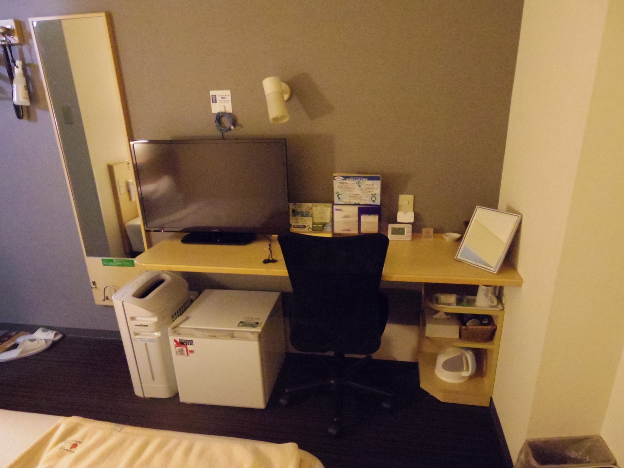 客室は、ユニットバスとベッド、テレビなどを置いた机と、典型的なビジネスホテルのつくり、少々、窮屈な感じがしました。