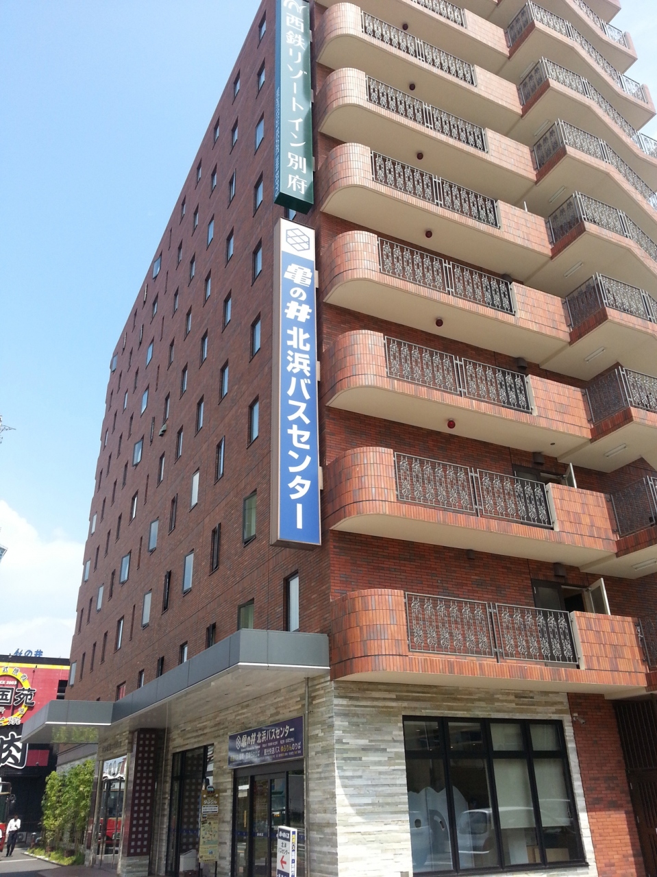 大分空港からリムジンバスで北浜バスセンターに降りるとすぐという立地で繁華街、別府駅も近く別府観光には便利です。別府なので温泉もあり、朝5時から1時までやっています。朝食はだんご汁、とり天、唐揚げ、カボスジュース、ギョロッケ(魚のコロッケ)等、大分名物が一通り食べれました。帰りは通り向かいのバス停から空港行きのバスがでているので便利でした。