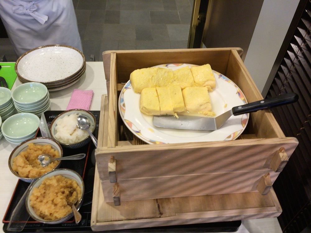 満室だったせいか朝食は宴会場に机と椅子を並べた団体旅行用の朝食会場という雰囲気でちょっと残念でした。目の前で作ってくれるダシ巻き卵が美味しかったのと、おばんざいの品数が豊富なのが好印象。
