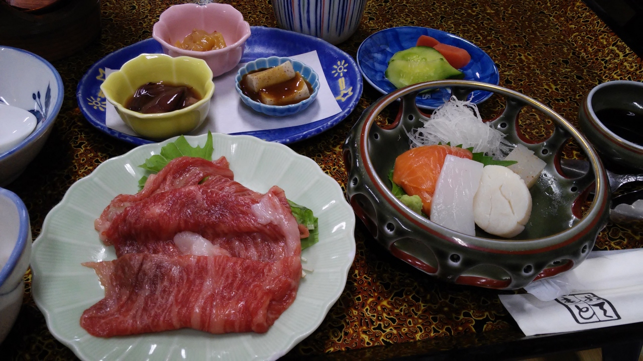 夕飯のメインは飛騨牛、少ししかなかったけど柔らくて美味しいかった。