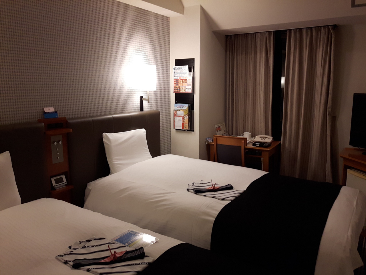 206バスの祇園停留所から歩いて2、3分、八坂神社のすぐ近くですが、ホテル名の表示は大きく出ていないです。フロントは二階になります。前からあるホテルをAPAブランドにしたものなので新しい施設ではないですが、ベットは大きめで狭苦しさはありません。歯ブラシやアメニティにこだわりを感じました。
