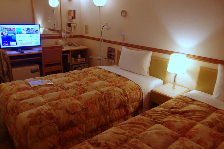 ハーモニーランドからの帰りにツイン添い寝で泊まりました。部屋は新しくてとてもきれいです。かけ布団もふかふか。狭いですが、大きな荷物はないので問題なし。ベッド下に30cm弱のスペースがあるのでスーツケースなど収納可能です。110cm幅のベッドでの添い寝もちゃんと眠れました。夕食の無料カレーはけっこうな人が利用していました。味はいわゆるホテルなどの業務用カレーでおいしかったです。無料コーヒーもあり。朝食も副菜の種類がいくつかあり、コンソメスープもありました。家族4名が夕・朝食べて泊まって一晩駐車して合計6,704円。 たいへんお世話になりました。
