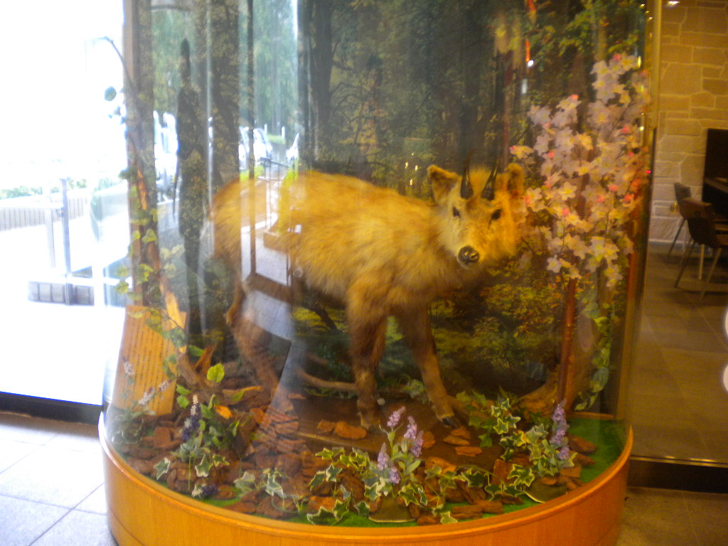激安だったので行ってみました、温泉はあまり広くは有りませんでしたが露天風呂が同じ階に有ったので気楽に何度か入りに行けました。かもしか荘というだけあってたまに見かけることもあるようです。玄関では剥製がお出迎えです。