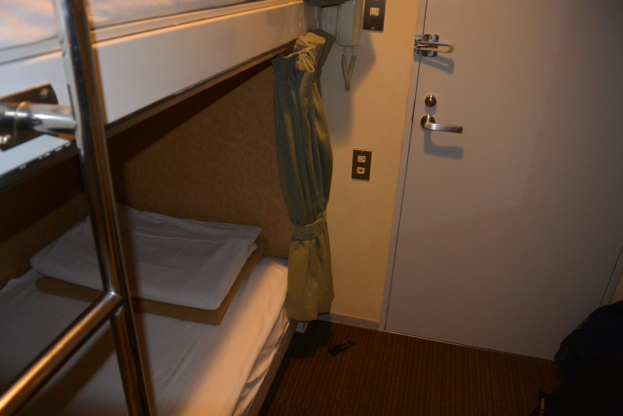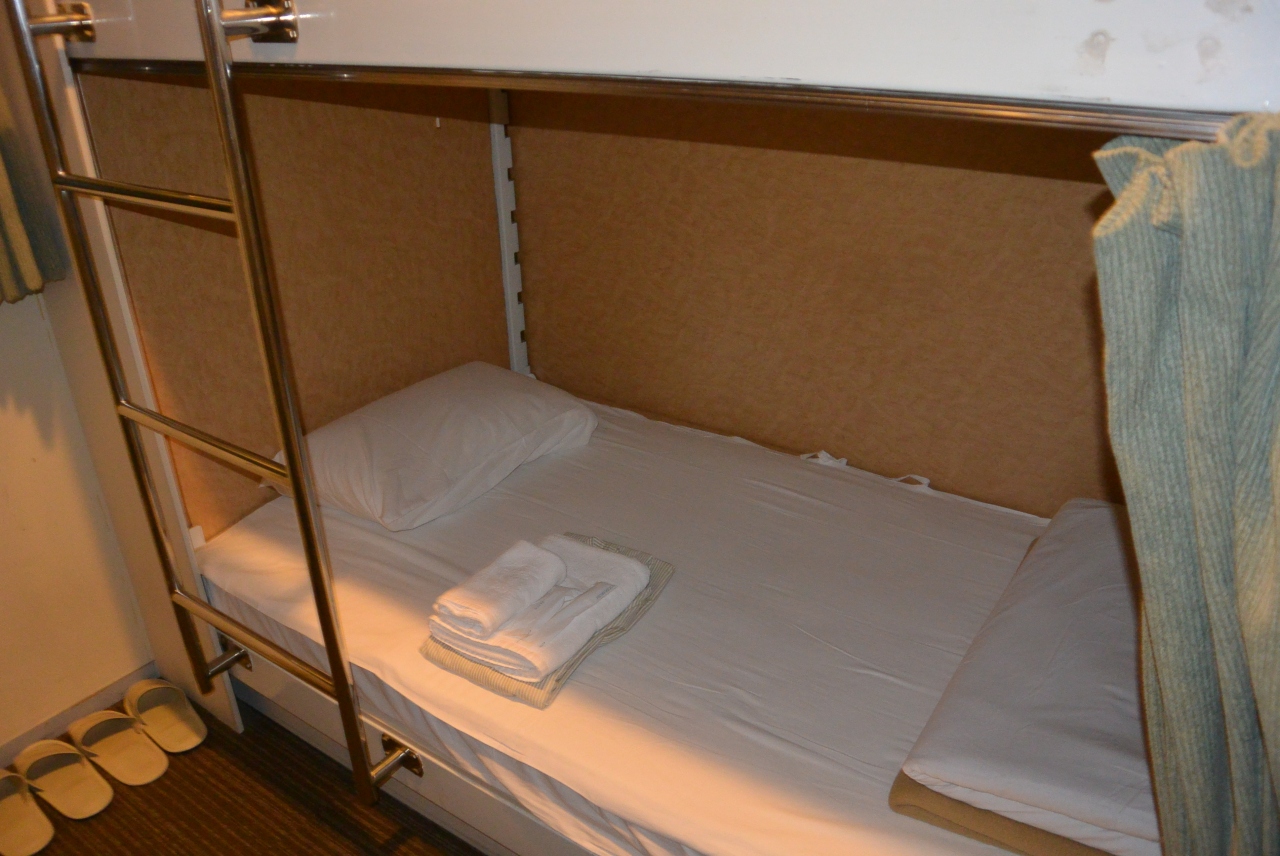 2段ベットを一人で使用する個室プランでした。部屋には新しい液晶テレビが設置されカーペットも清潔でアメニティも付属していました。問題はベッドのサイズです。とても短いのです。頭か足の一部が端に板に当たります。仕切りの板を外してほしいと思います。ひょっとしたら二段ベッドの下段を選択してしまったせいでしょうか?体を斜めにしたら安眠できました。扉の開閉音がやや気になりましたが、夜間は静かでした。