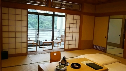 9月限定素泊まり格安プランでしたが、部屋は次の間付きの12.5畳で、一人にはもったいないくらいでした。眺めは、残念ながら、コンクリートの屋根の奥に市街地が少しみえるくらいでした。