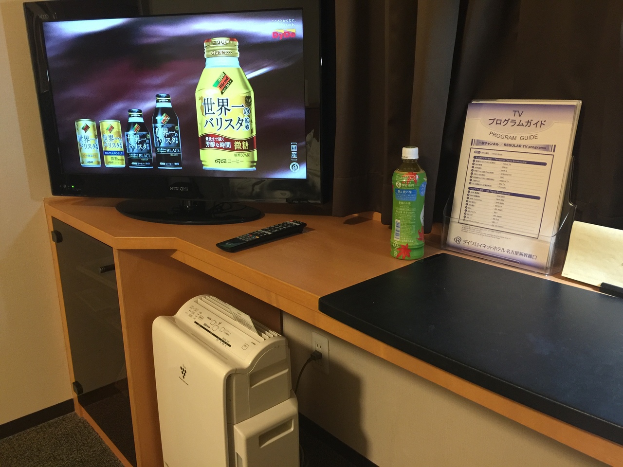 名古屋駅の東口(新幹線側)から徒歩で3、4分くらいか。途中に狭い店舗ながらもローソンがあって、利便性はまずまず。アイスと飲み物を購入。チェックイン後、部屋に入って冷蔵庫を探すが、何度見ても冷蔵庫が見当たらない。あわててアイスを食べざるを得なかった。なんで冷蔵庫がないのか理解できない。ズボンプレッサーや空気清浄機は標準装備なのに。