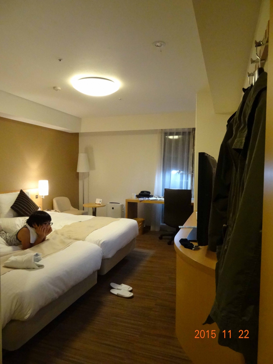 当日の朝予約で二人で¥15,000と言うのが見つかった。駅から近いのも、到着が遅くなりそうだったので助かった。小学生の子供と二人で宿泊した。部屋は典型的なビジネスホテルだが、その割には広々としていて、良かった。また、フロントが親切できちんとしている割に、安価だと思う。