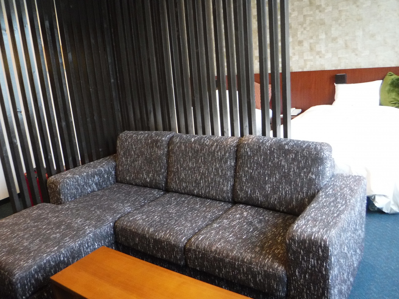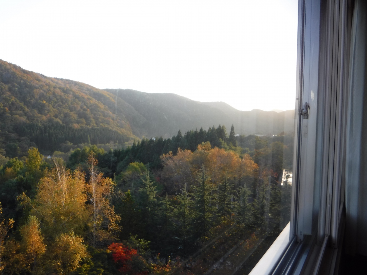 部屋に入ると部屋が無料で広いツインルームにグレードアップされて感激しました。紅葉シーズンにも関わらず平日なので部屋に空きがあったのでしょうか。大きな部屋にキングサイズのベッドとシングルベッドがあり、ソファは横になって足を伸ばせるタイプ、他にもオットマン付きの高そうな椅子もあり、一人で使うには勿体なかったです。大きなガラス窓からは秋の景色が楽しめました。