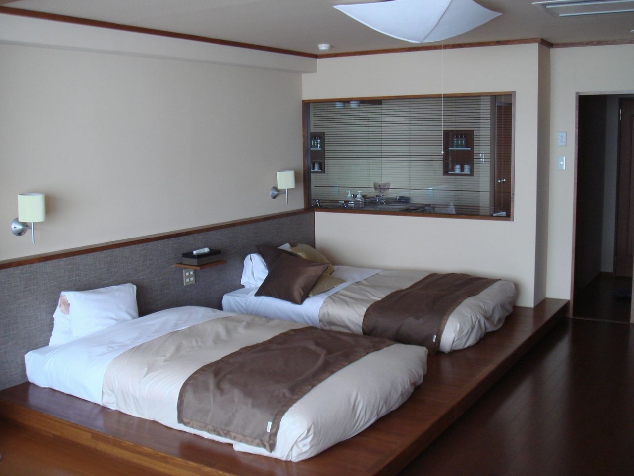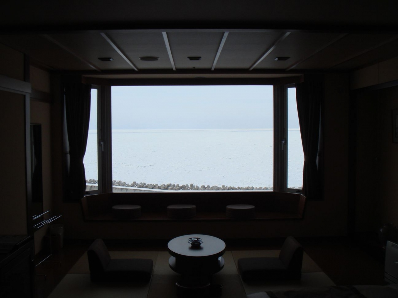 流氷の時期に宿泊しました。この時期は宿泊料金が比較的安いので、奮発して展望和洋室を予約しました。最上階客室は出窓になっていて、オホーツク海の一面の流氷原が見渡せて見事です。ベッドからも、洗面所からも眺められます。客室は、窓側がくつろぎスペースで、中央に大きなベッドが配されています。ゆったりした配置で、居心地も眺めも良い客室です。