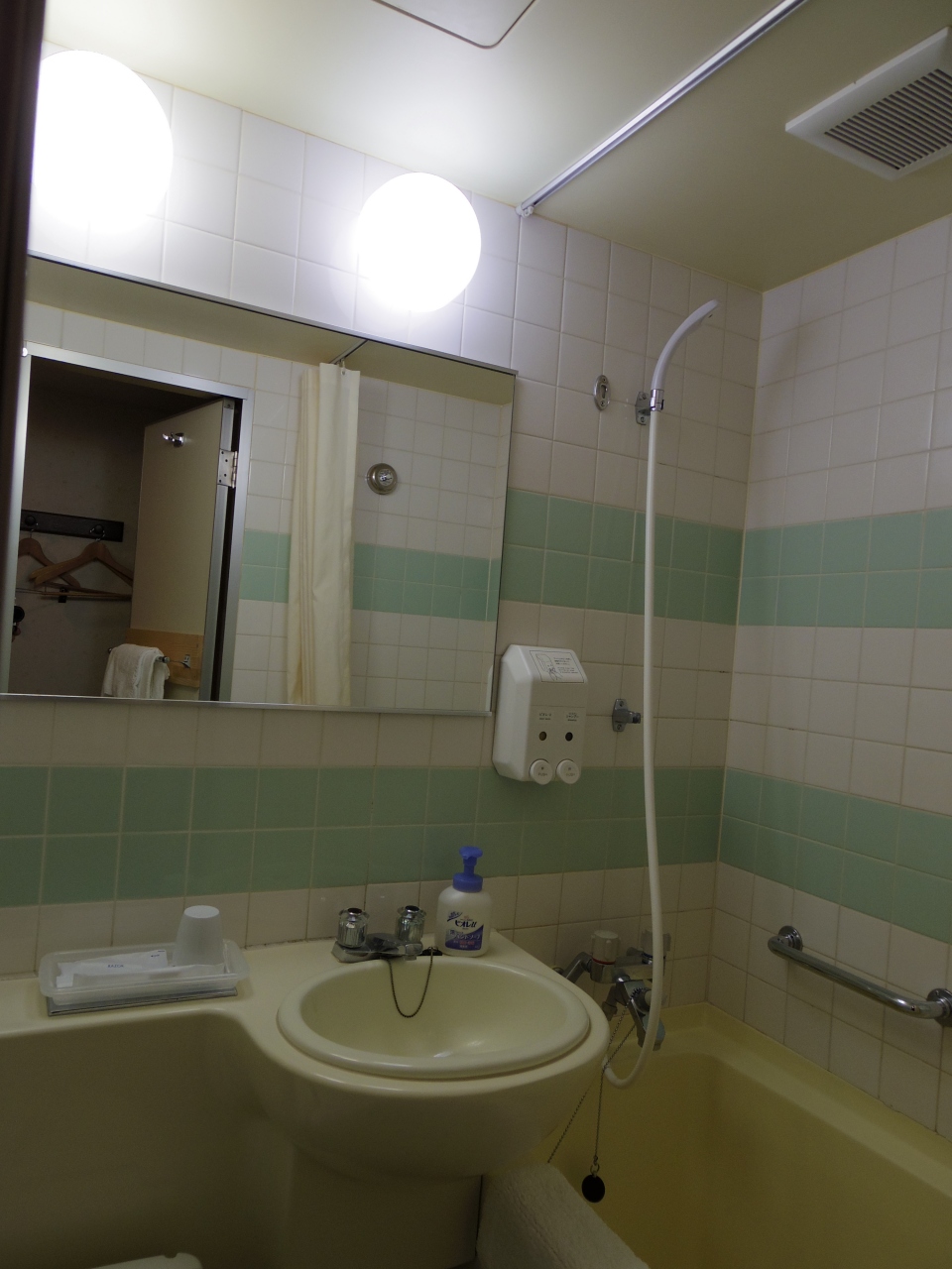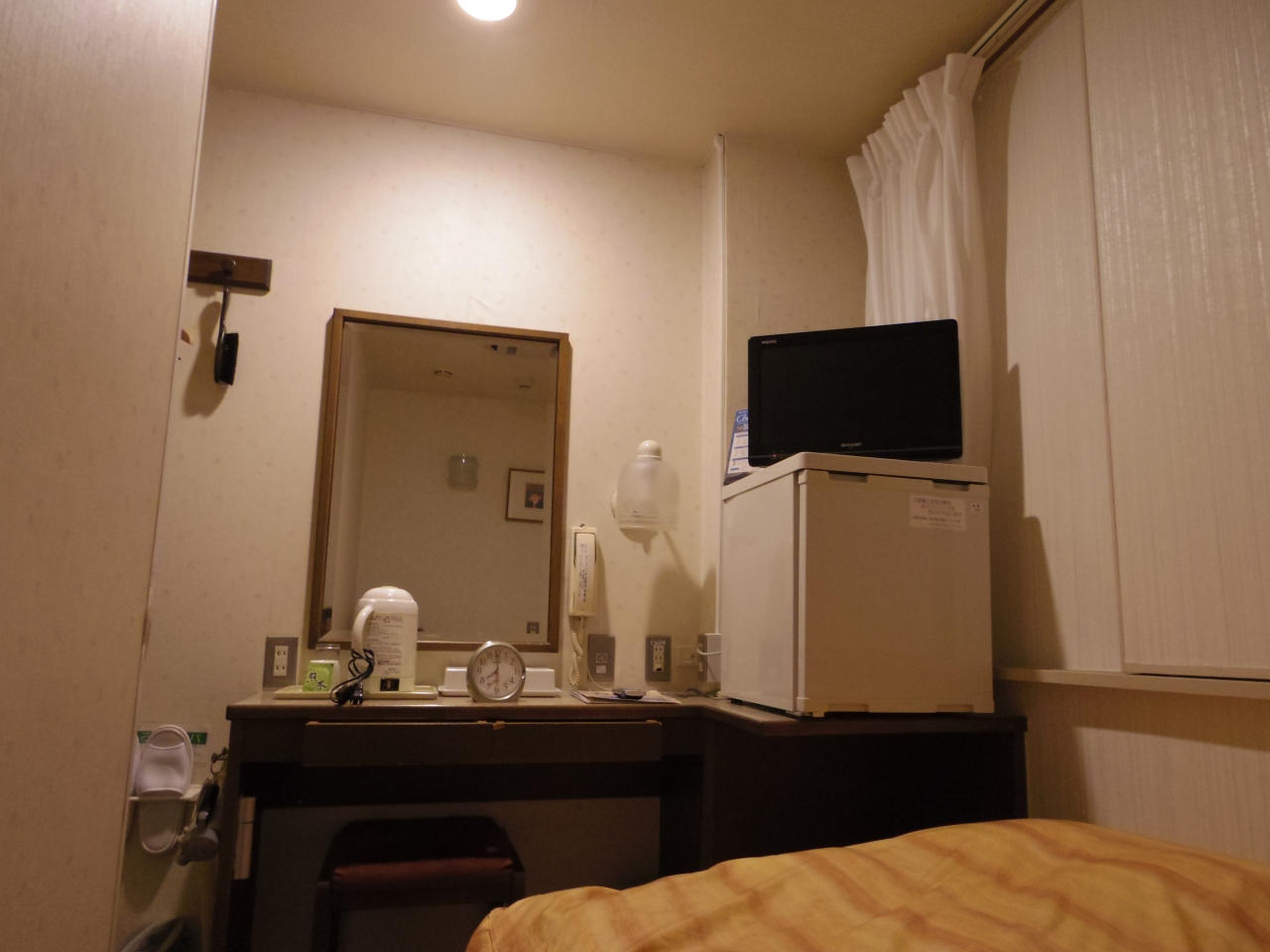 客室は9平米とのことで、ある程度予想してはいましたが、ユニットバスとベッド、つくえといす、窓際の棚の上に小型冷蔵庫があり、その上にテレビが乗っている機能的なつくりになっていました。