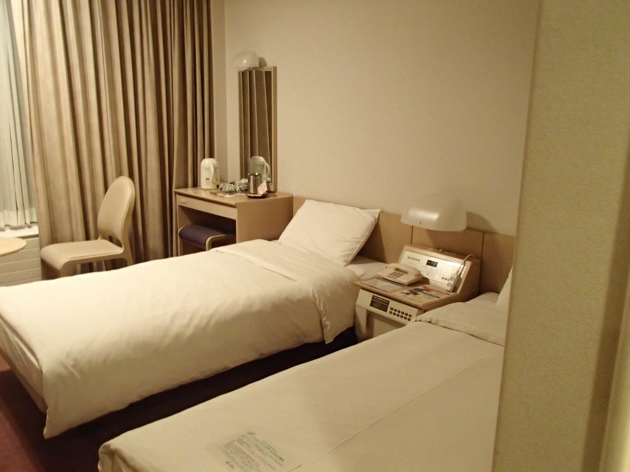 最近のホテルでは珍しい、シングルベッド2台でした。部屋の面積は22㎡と広くありませんが、2人なら十分でした。夕食、朝食はバイキングを頂きました。美味しかったです。