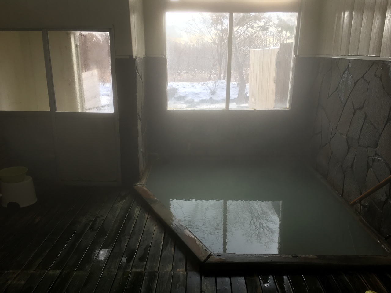 500円払って浴室へ。小さな内湯と露天風呂があるシンプルな作りです。湯は登別らしく白濁していますが、強烈な硫黄臭はありませんでした。露天は底が少しゴツゴツしていましたが、眺めがよく、雑木林や海も見えました。湯温はぬるめでしたが、いつまでも入っていられる感じでちょうどよかったです。湯上り後はいつまでもぽかぽか感があり、肌はさらさらになり、その日一日中そんな感じが続きました。宿自体は家庭的な感じでしたが、温泉の泉質は最高だと思いました。