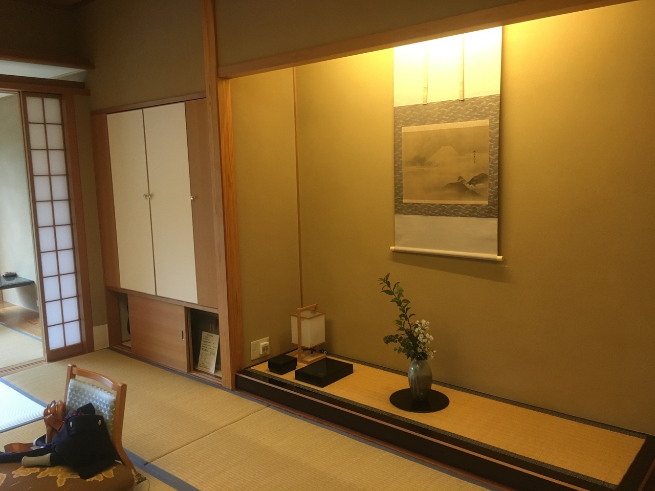 チェックイン後、しばし、ロビーで休憩。ロビーは明るく、天井も高く、解放感があります。外は水が流れてきれいです。ロビーで休憩しているときに、抹茶とお茶菓子が出てきました。担当の仲居さんの愛想もよく、非常に好感が持てました。