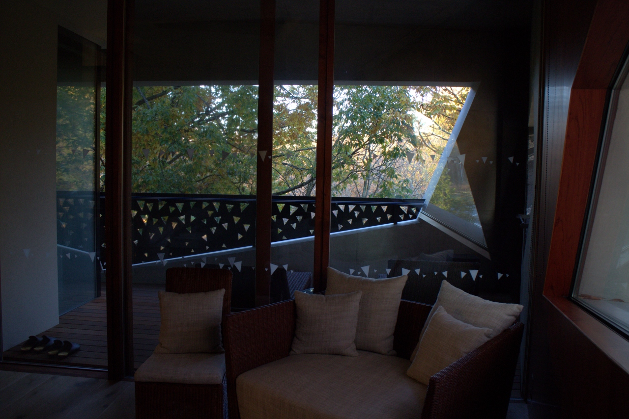 部屋の大きな窓からは木々が見え、バルコニーではその木々を眺めながらコーヒーを頂けます。
