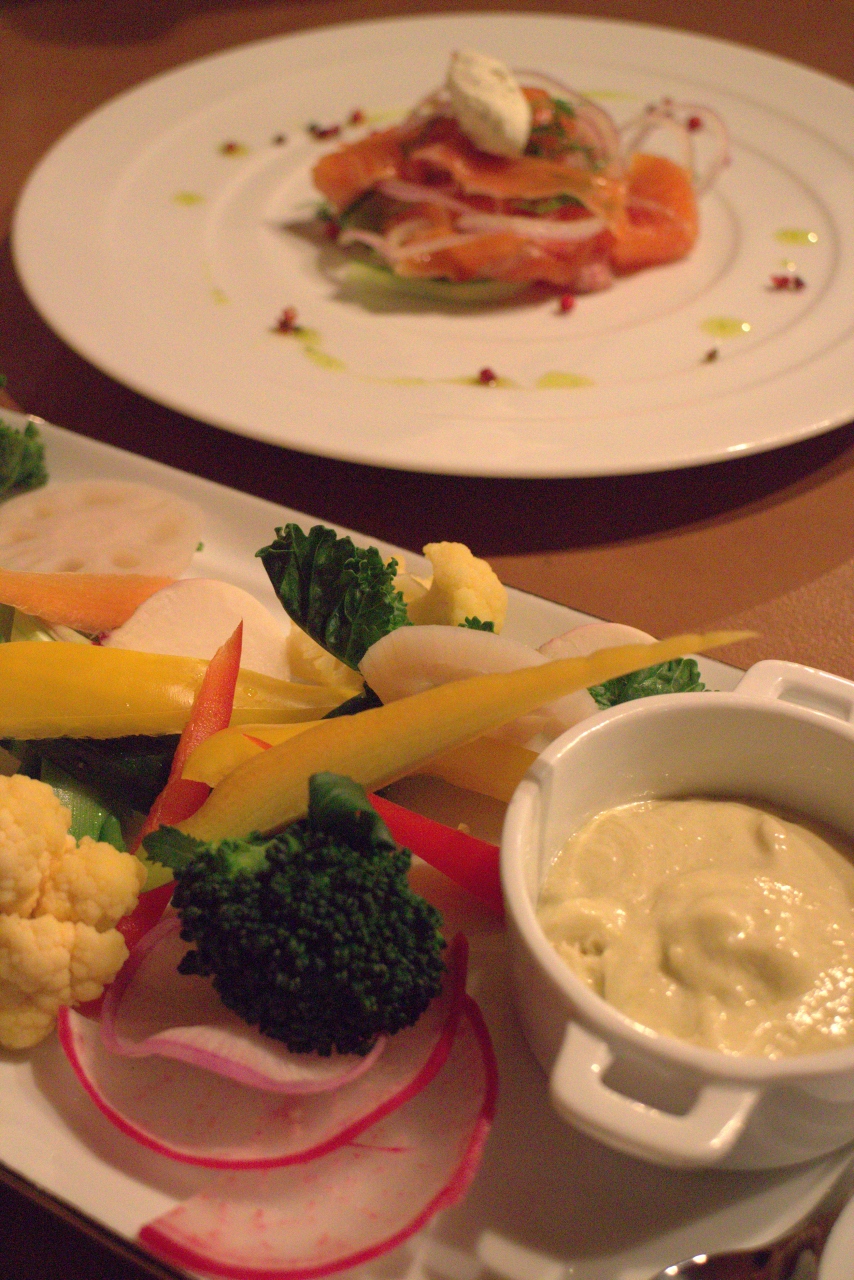夕食はホテル隣接のレストランで。メインは甲州ワインビーフなのですが、お昼に蒸留所のレストランでお肉を頂いた為ここでは甲州ワイン鱒を。