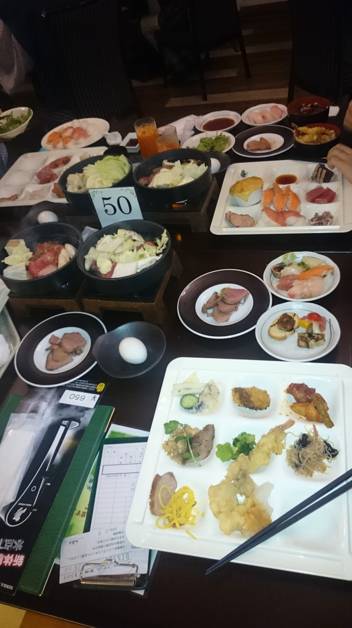 食事は、バイキング形式で、バラエティは、申し分無く、蟹や、フォアグラを使った逸品、お鮨、ローストビーフと、ホテルのバイキングの良さを満喫出来ます。