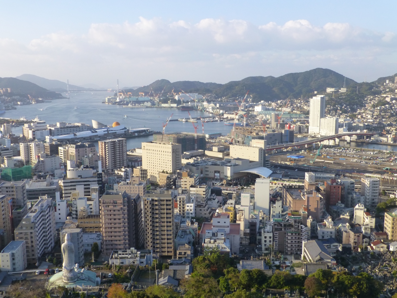 レンタカーで「ホテル長崎」に、くねくね曲がった坂を通って着きました(長崎市の特徴? 地元の人はタクシーを使うので有名だそうです?)。フロント場所は大きな半円形の展望デッキがあり山からの市街地が見えました…夜景が楽しみ! 部屋は和室で、椅子も無いので、困ったですネ(靴下を履き替える,,) 眺望は抜群;ビル街/港/もう一つの山