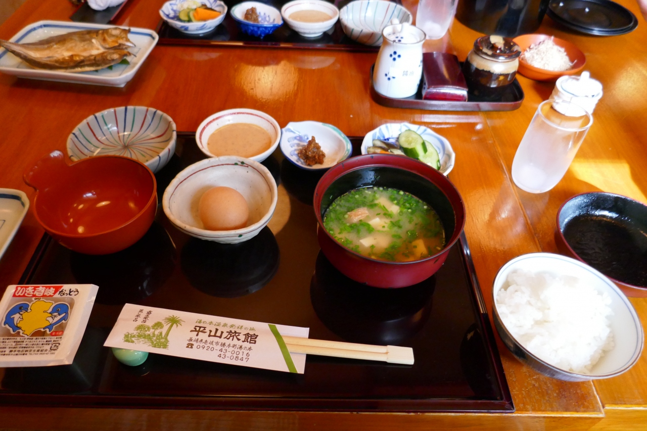 平山旅館は超すばらしかった.1泊2食付23000円での豪華料理,刺身,イセエビ,うに,アワビとポピュラーなごちそうが並ぶ.これでもかという風に料理が来る.おかみの思いが行き届いているのか心づくしのサービスがうれしい.朝食も自分の畑で採れた新鮮な山盛りの野菜や壱岐豆腐などなど.風呂も古風な温泉で,露天風呂と温泉の蒸気サウナがある.1000過ぎまでゆっくり滞在し温泉ステイを楽しんだ!ここは今まで宿泊した旅館の中でもぴか一と思う!絶対おすすめ