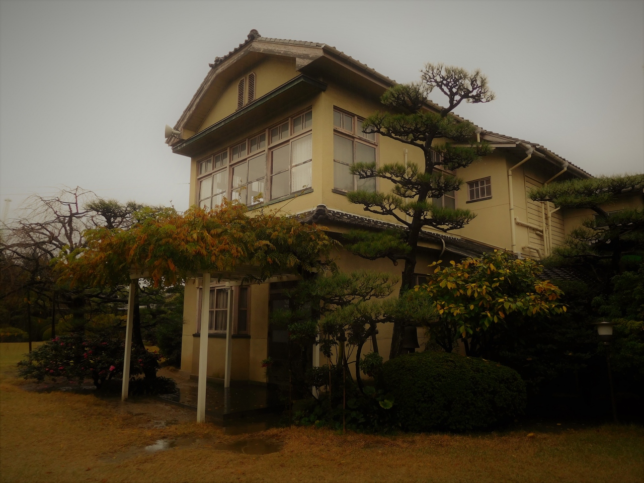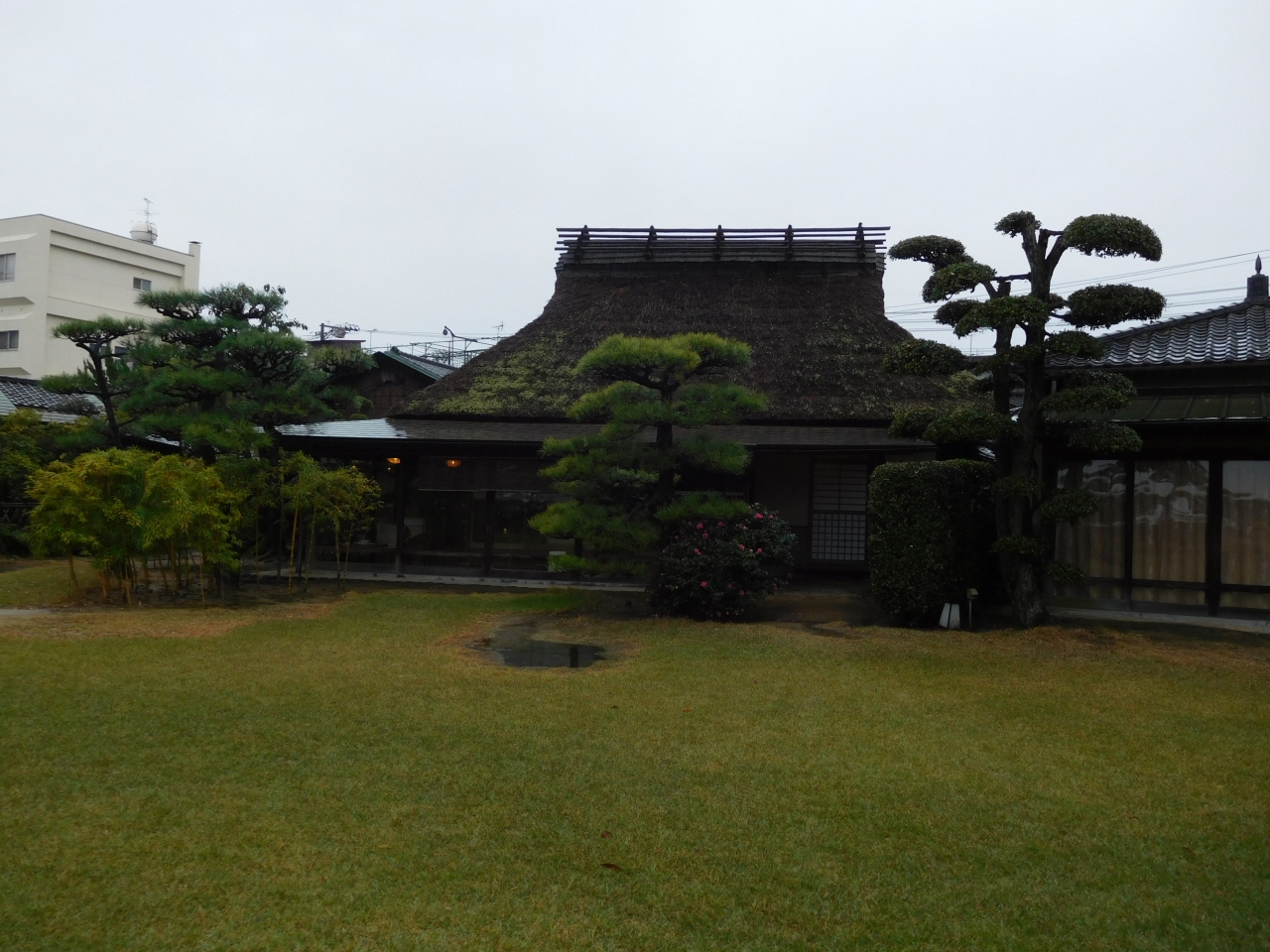 一覧を見る敷地内には洋館や茅葺屋根の建物などがありました。