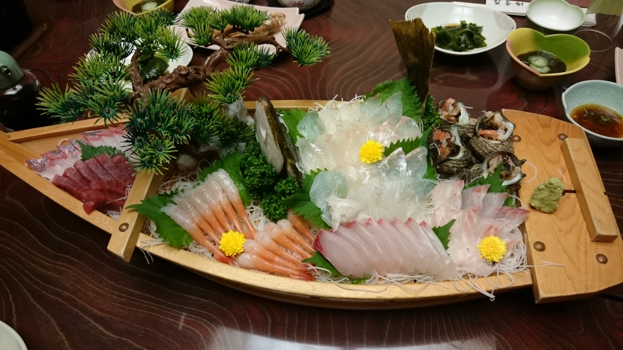 地魚の夕食は舟盛り・蒸し物・焼き物・煮魚・酢の物・茶わん蒸し・わかめサラダ・天ぷら・ごはん・お吸い物・フルーツ。