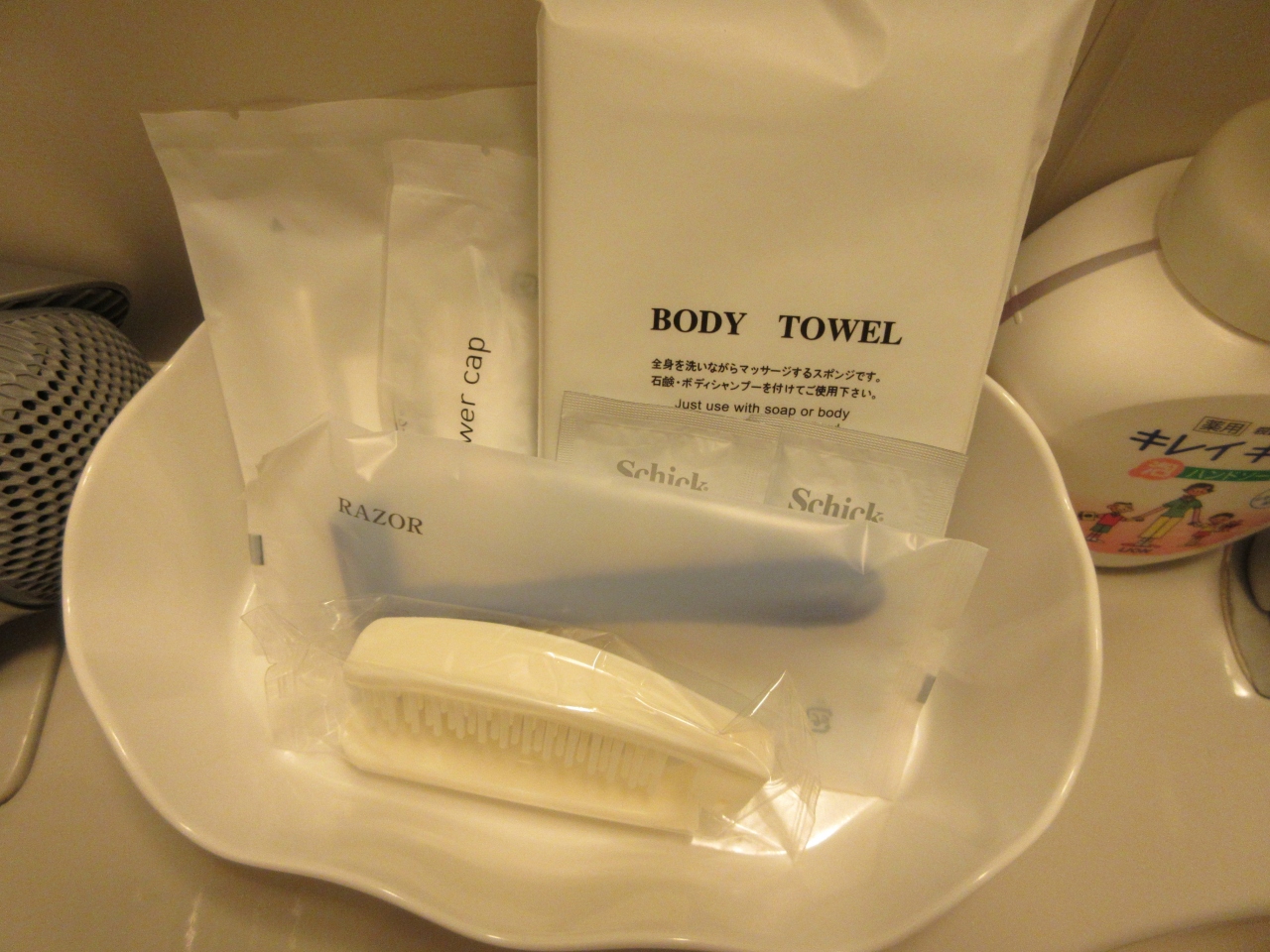 歯ブラシ、櫛、カミソリ、ボディースポンジ。相変わらずボディースポンジが付いていますが、理由が良く判りません。