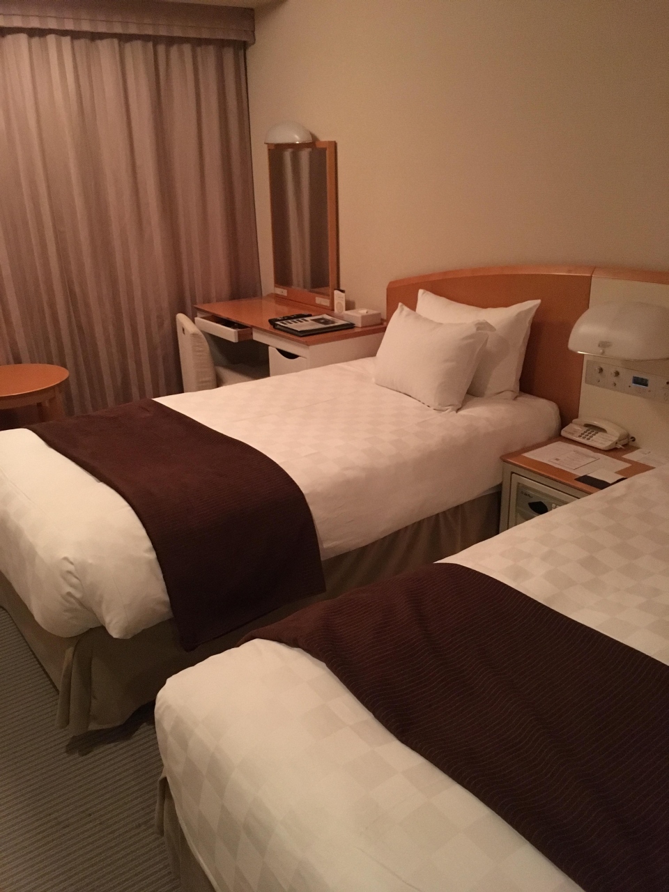 品川プリンスホテルはグレードによってびっくりするような狭い部屋に泊まったこともありますが、今回のメインタワーのツインの部屋は標準的な部屋でした。タワーと名前が付くだけあって品川の夜景も見られます。ただ、ホテル内のコンビニで買い物をして戻ってから部屋に冷蔵庫がないのに気付きました。最近はどこでもあるものだと思い込んでいました。