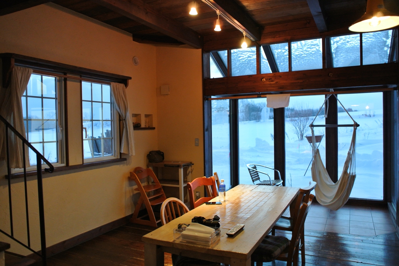 可愛らしいコテージは内部もシンプルで居心地良い空間。B&Bの宿ですが、雪で移動も大変だと思ったので別料金の夕食も付けました。美瑛の美味しい野菜と肉で作られた夕食は、温かいうちに食べられるように何度かに分けて運んでくれます。部屋でゆっくり出来、一軒家の別荘にいるように寛げました。