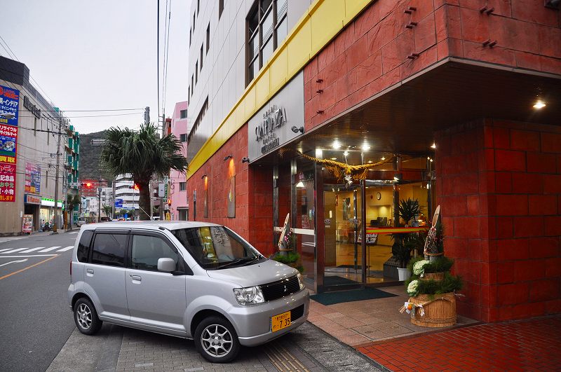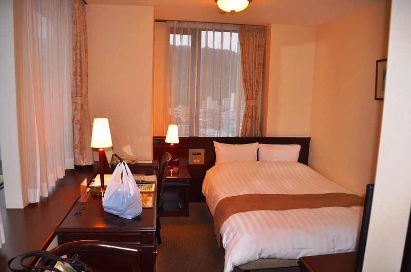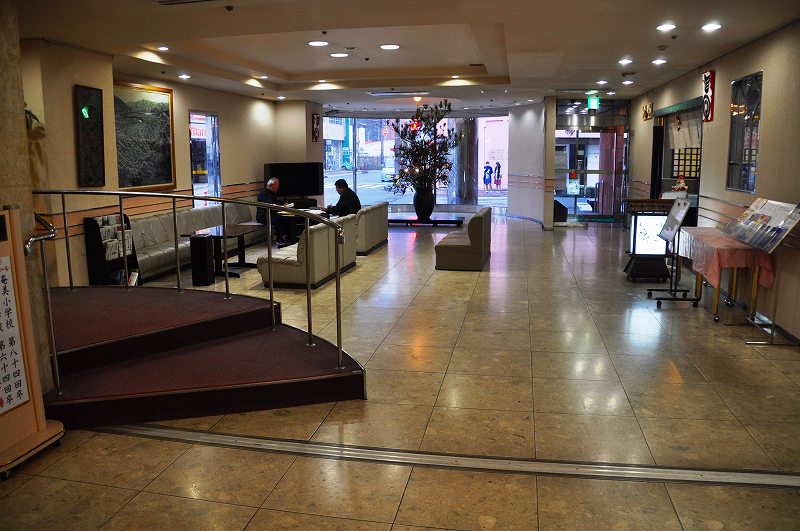 部屋はシングルでもセミダブルのベッドなのでゆったり眠れた。その部屋は道路側だったので、窓から名瀬港を見ることができた。夜、鹿児島新港や沖縄に向けて出港するフェリーも見える。ロビーは広く、応接セットもゆったりしていた。プロ野球のDeNAベイスターズが奄美キャンプの時、泊まるホテルでもある。