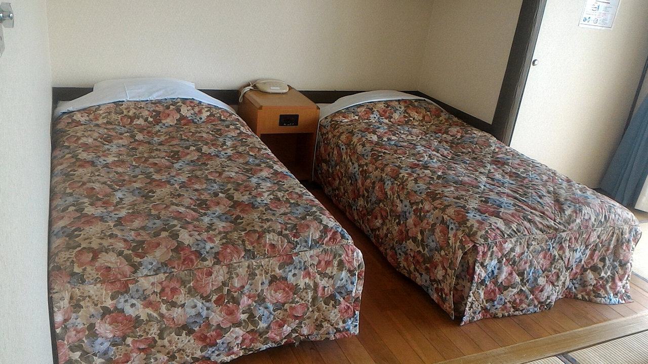 宿泊したのは2階、ツインベッドと和室、バスタブ、トイレ付きの部屋。