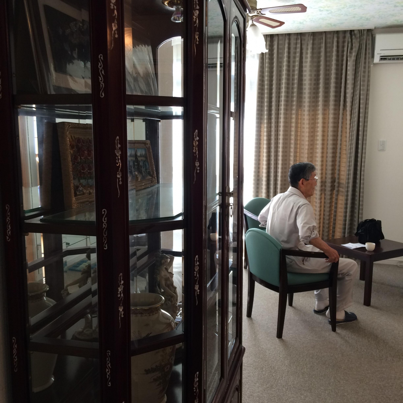 大きなベッド、テーブルと椅子のセット、ガラス張りのシャワーボックス、ジャグジー付きのお風呂、アンティーク調のガラスキャビネット、初めて見る空間に両親もとても喜んでくれました。