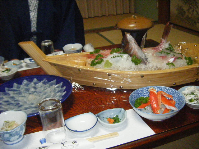 「ふぐフルコース」を予約、「鯛、イカ、甘エビの刺身の船盛り」、「てっさ」、「焼きふぐ」、「ふぐから揚げ」、「ふぐの皮の酢の物」、「ふぐ鍋」、「茹で蟹」、「鯛の塩焼き」まで出ました。ふぐの切り身のサイズが今まで食べた切り身と比べると大きく食べ応えがあり、味も美味しく最高でした。
