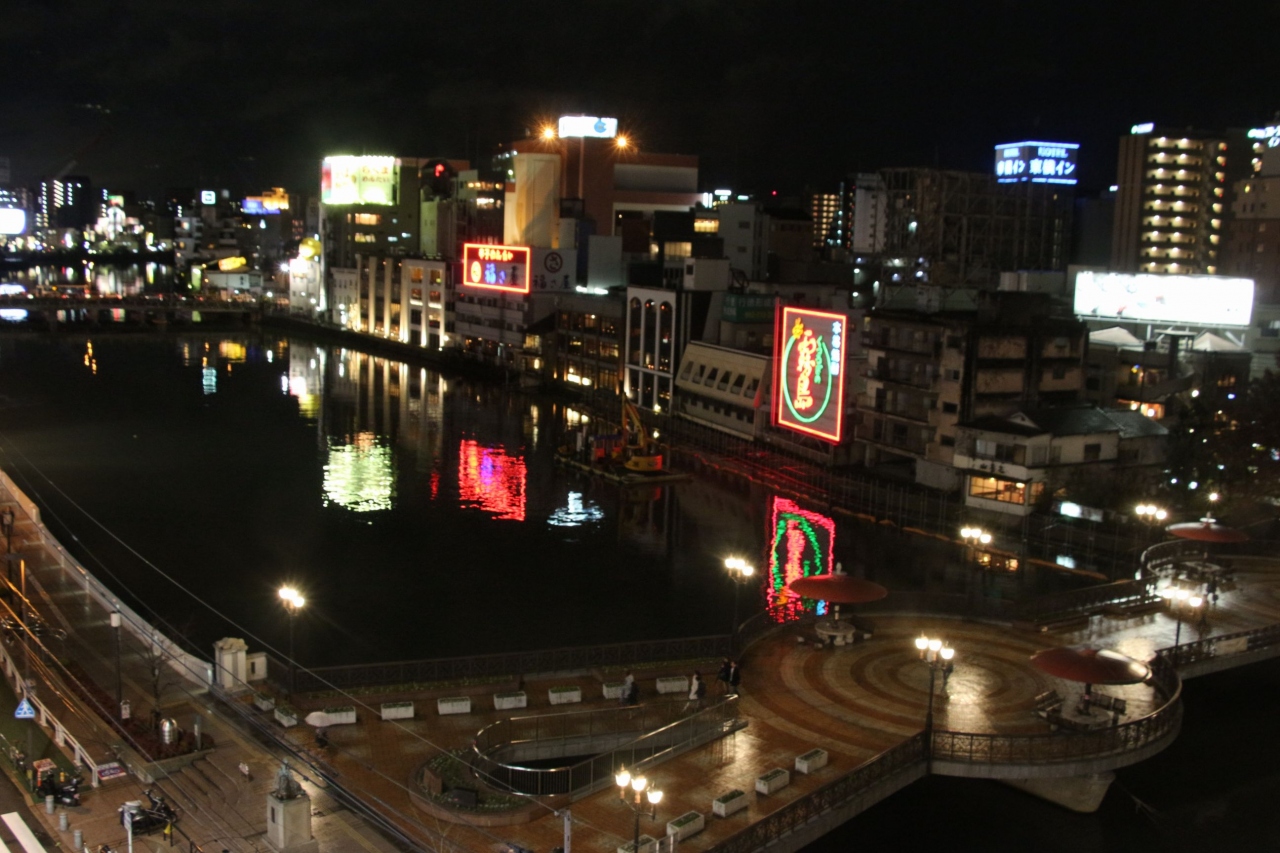 九州最大の繁華街・中洲の中心、那珂川のほとりに位置してます。博多駅からは車で10分程度の距離です。ホテルから中州に出かけるには絶好の場所に有ります。