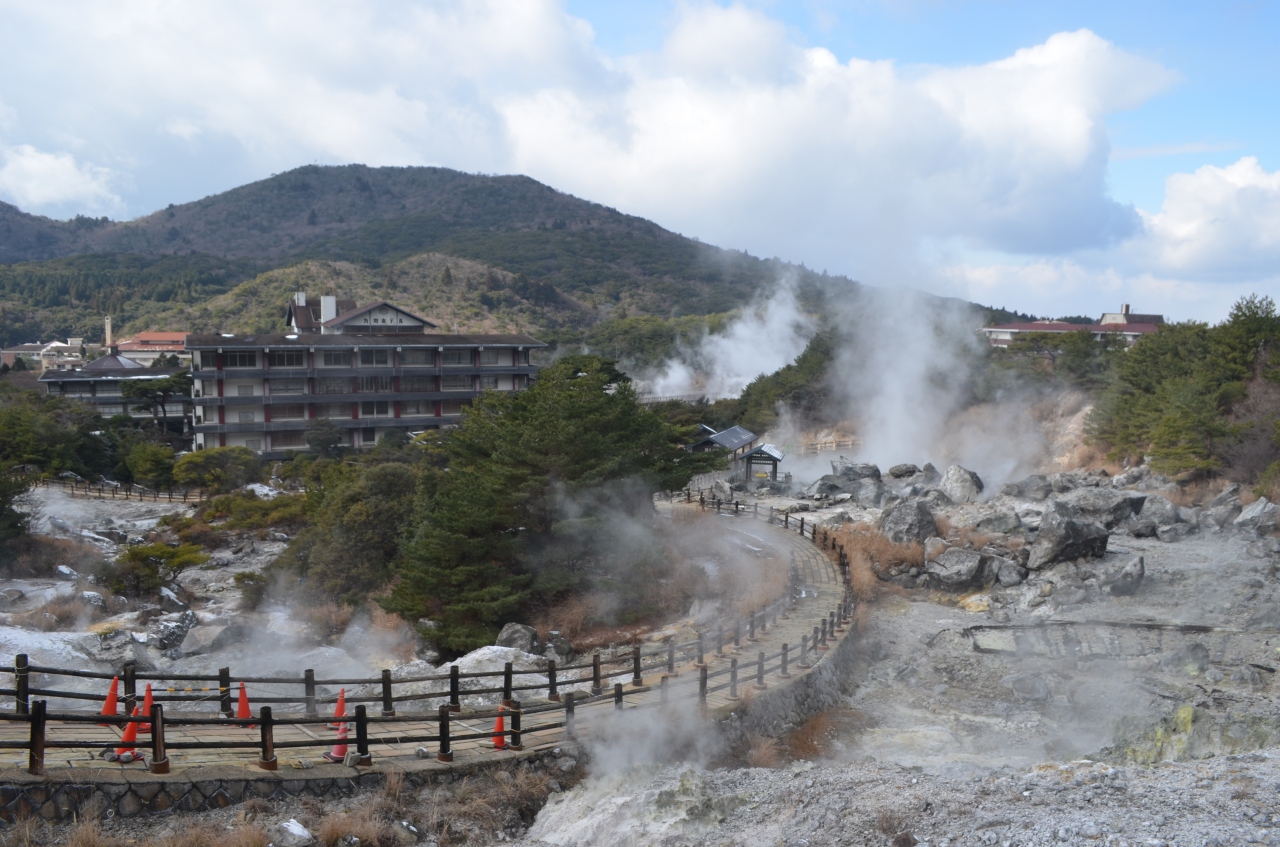 雲仙のバス停目の前にあります。ホテルの裏は雲仙地獄なので、部屋からの景色は