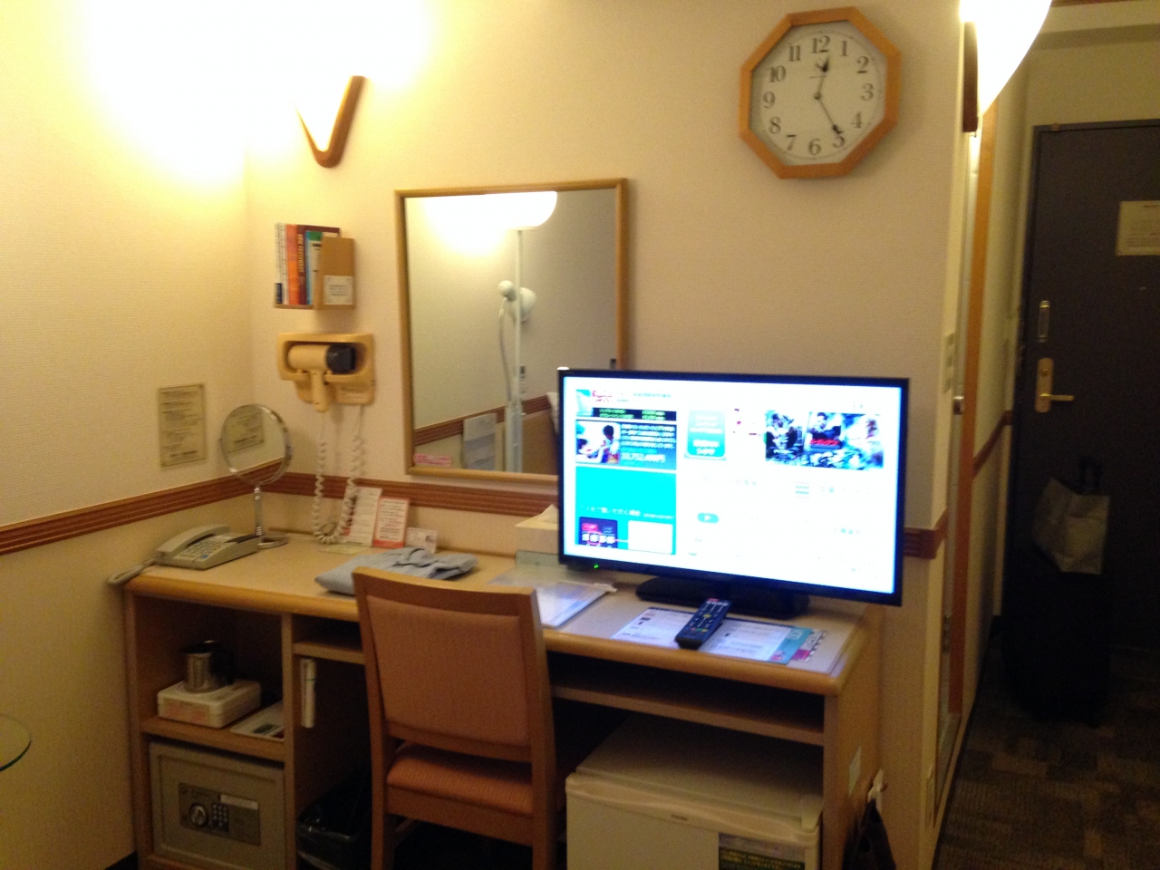 部屋が小さいのでそんなに大きい必要もなかったけれどTVが凄く大きかったです。駅からも見えるし一本道なのですが駅からは思ったより遠いかったです。周辺に食事のできる店が多かったですが最終便で着いて11:30頃だとlast orderになっていました。ホテルで聞いたら裏にステーキハウスは未だやっているとのことでしたが夜中にステーキは無理でもっと軽いものをと聞くとホテル前の大通り沿いを歩いていくと定食屋があるとのことで行きましたがついて10分ほどでラストオーダーでした。