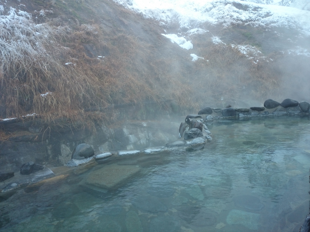 露天風呂はすばらしいです。宿の建物から山の傾斜に沿って階段を下って行った先に男女別でそれぞれに大きな岩風呂と小さめのコンクリートの浴槽があります。無色透明・ほぼ無臭のまろやかなお湯で、感覚的には北海道のニセコ地区にある「新見温泉」の泉質に近い感じがしました。大きな岩風呂はぬるめ(39度くらい)で、すぐ下を川が流れているので川の音を聞きながらゆっくりと長湯できます。また周囲では熱湯の源泉が出ているようで、夏はこの川に流れ込んだ源泉がちょうどよい温度になり、「天然川風呂」として入浴できるようになるようです。