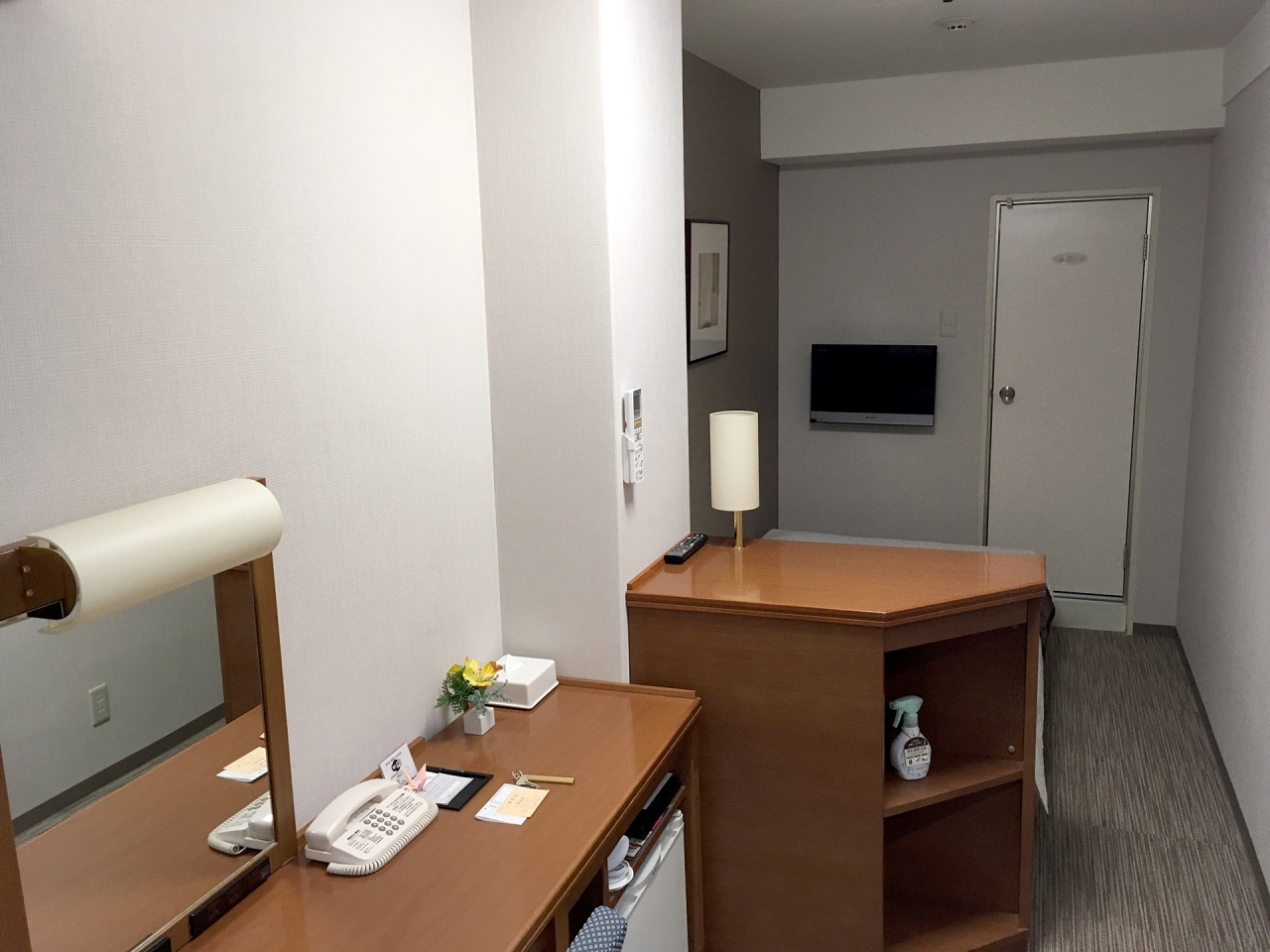 客室自体は、建物の中央に2部屋隣接させて作っている構造なので、面積を確保するために細長くなっています(写真参照)。住むのは嫌ですが、泊まる分には、動線が1つという便利さもあります。