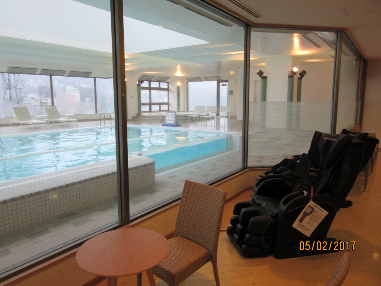 上の階9階だったので静かで山側の眺望を楽しんだ。10階には大浴場(サウナ・露天風呂付)、プール・ジャグジーがあった。電動マッサージチェア2台無料。