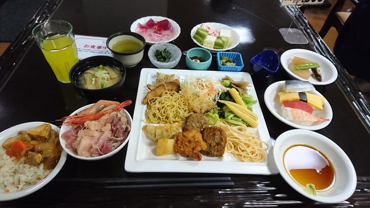 食事内容は、ビックリする様な豪華なメニューはありませんが、お造り・鍋物・汁物・煮物・焼き物・揚げ物・麺類・蒸し物・生野菜・フルーツ・スイーツ等々、和洋中が一通り揃、一品一口ずつ頂いても全種類食べ切れない程の料理が並んでいました。