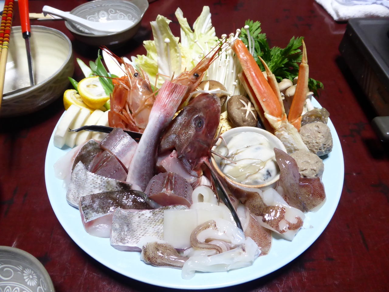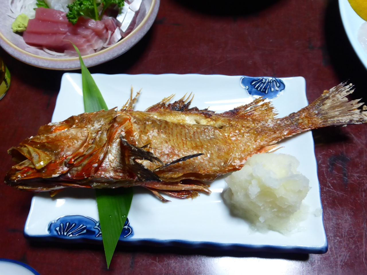食事は部屋食です。海鮮鍋プランで、刺身3種、キンキの塩焼き、海鮮鍋という献立。キンキの塩焼きは絶品。海鮮鍋も豪華でおいしかったです。これで12000円程と非常にリーズナブル。朝食もおいしく食事は満足できるものでした。設備面では多少不便さもありますが、その点を了解した上で宿泊する分には非常にいい宿だと思います。