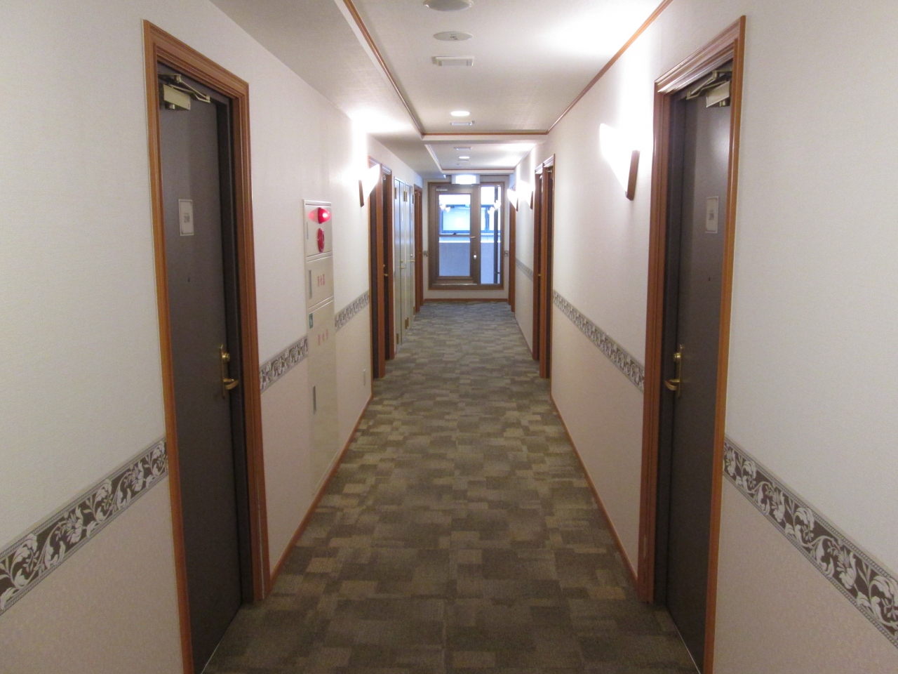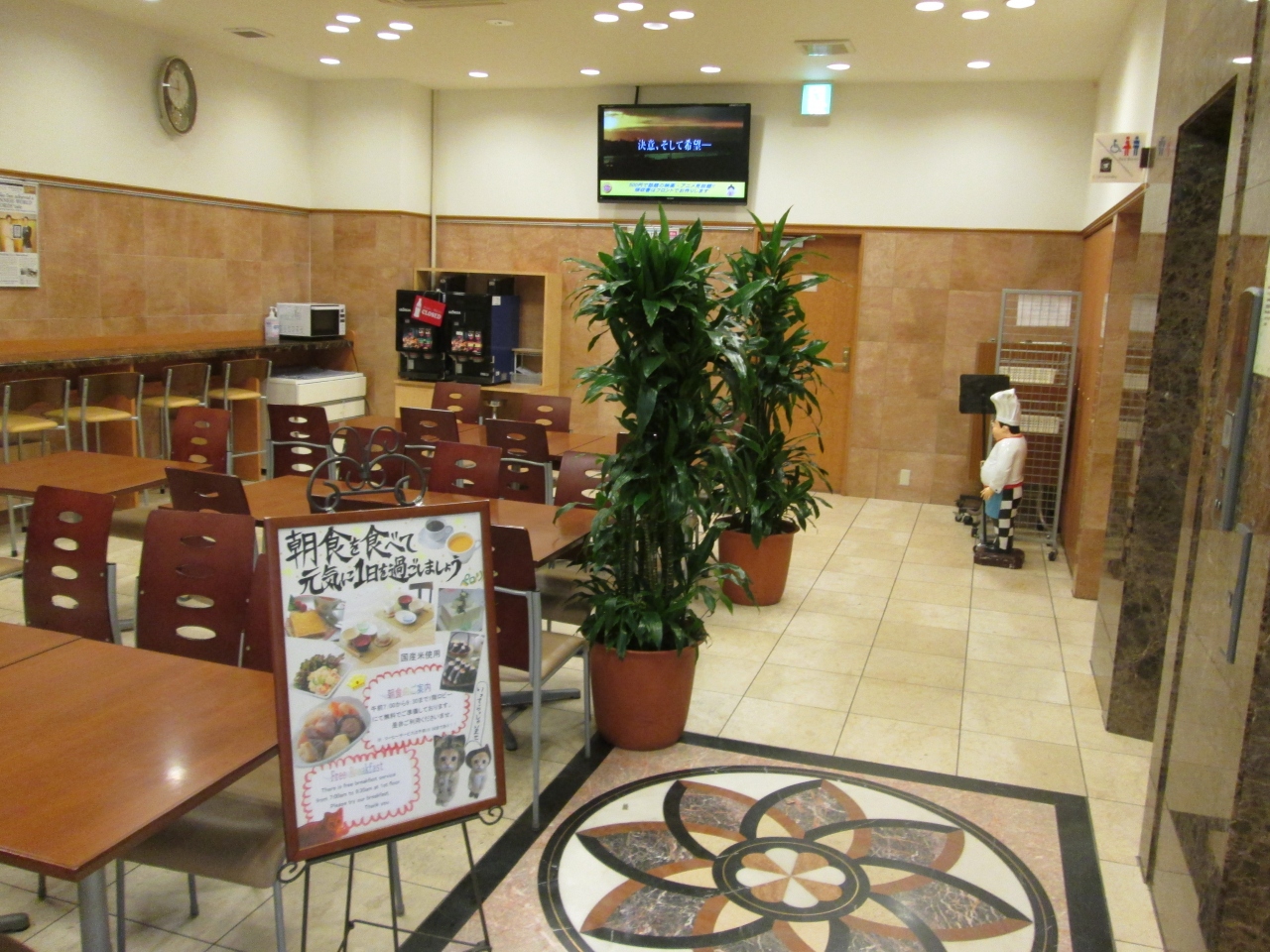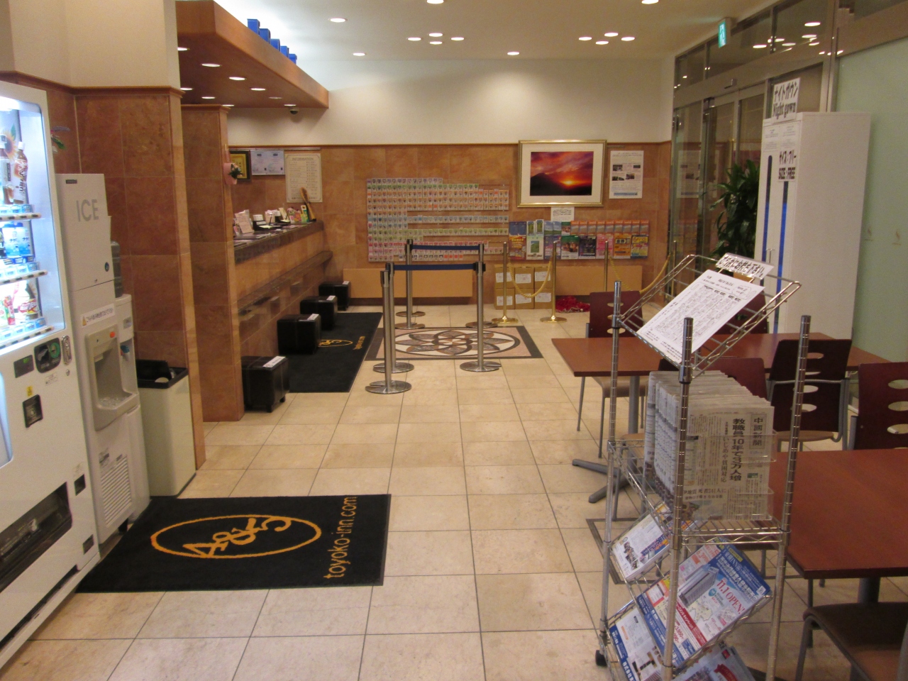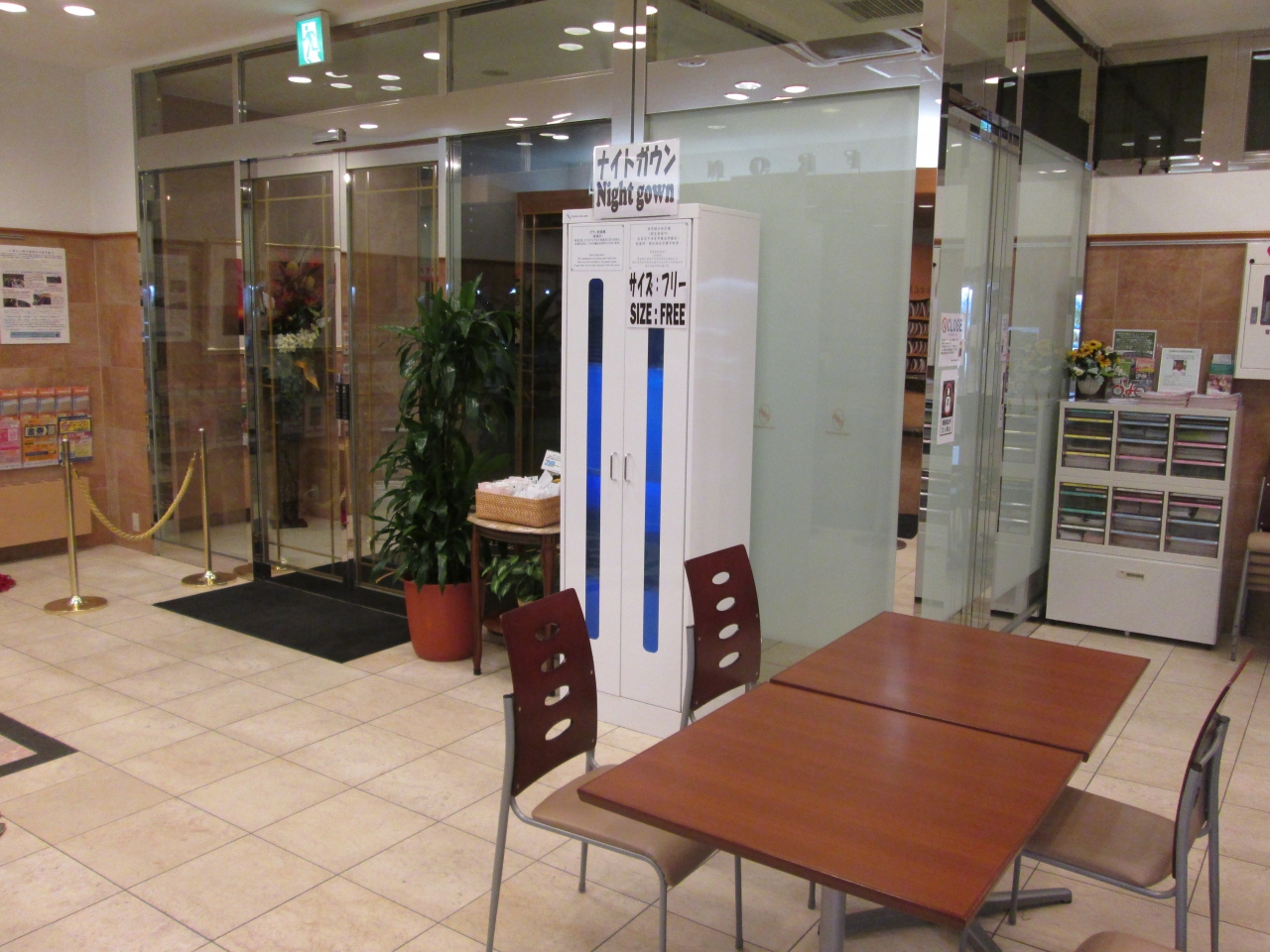 1階にはビジネスホテルの定番である新聞サービスがあり、製氷機とウォーターサーバーが設置されていた。また、1階入口には館内・客室で着用するガウンが置いてあった。共通の休憩エリアには自動販売機、電子レンジがあり、重宝した。
