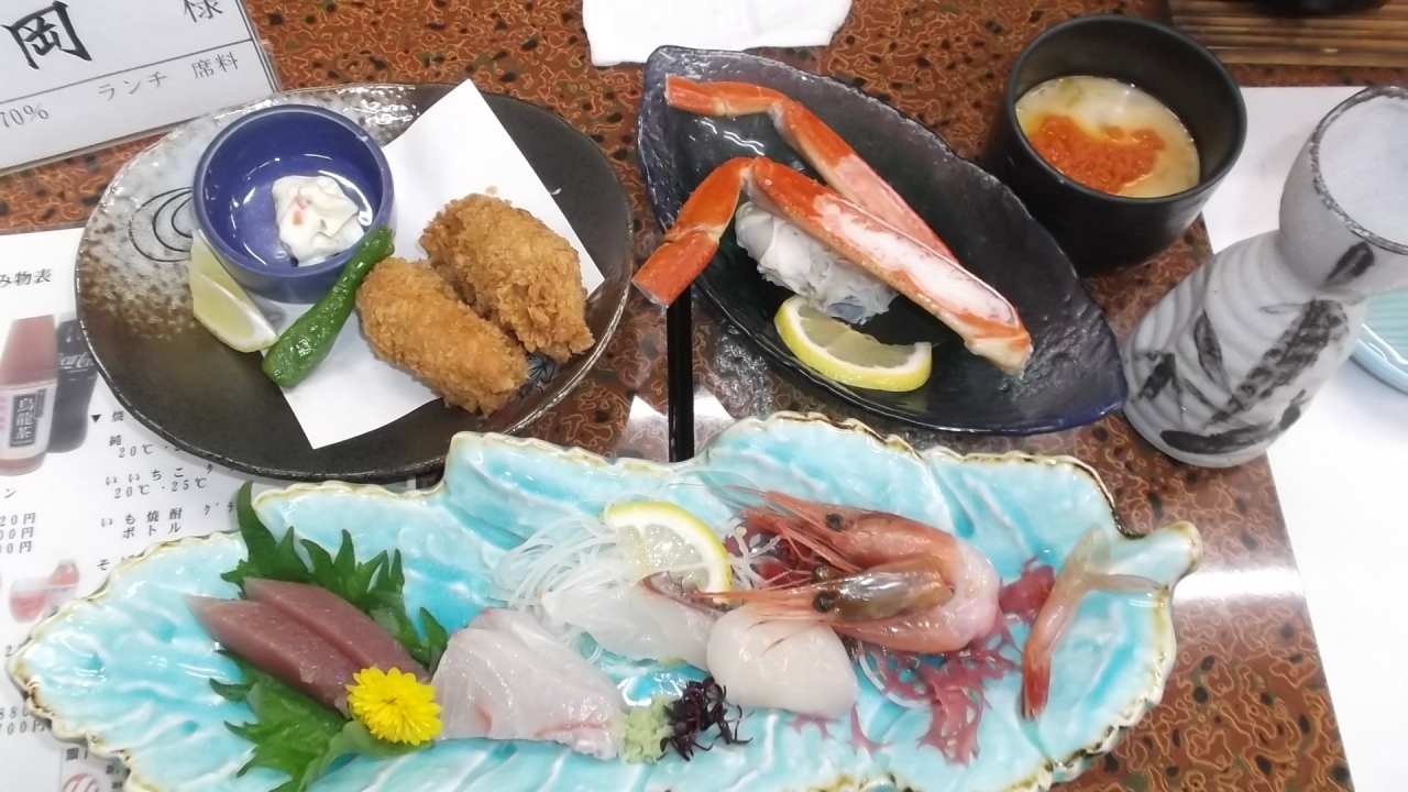 朝夕とも会席膳で地元の食材と地酒で会話も弾みました。
