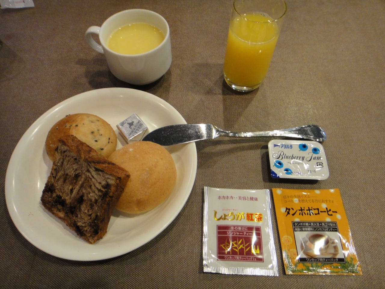 朝食無しのプランでも、無料のパン・コーヒー・ジュース・スープがサービスです。