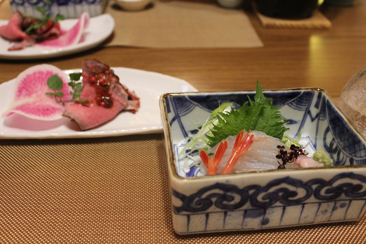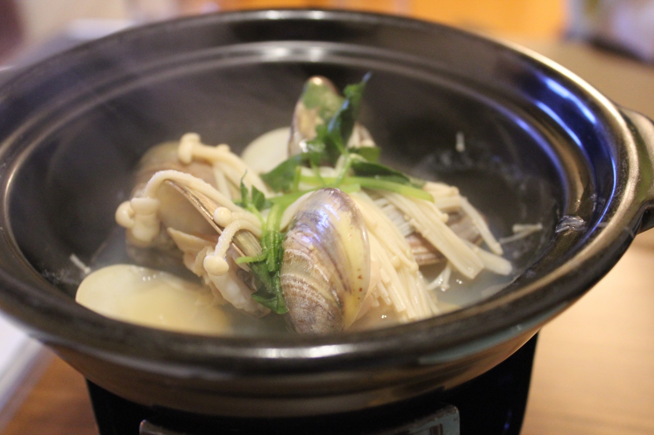 お鍋がはまぐりのお鍋、お肉はローストビーフ2切れ、お刺身が3種類、