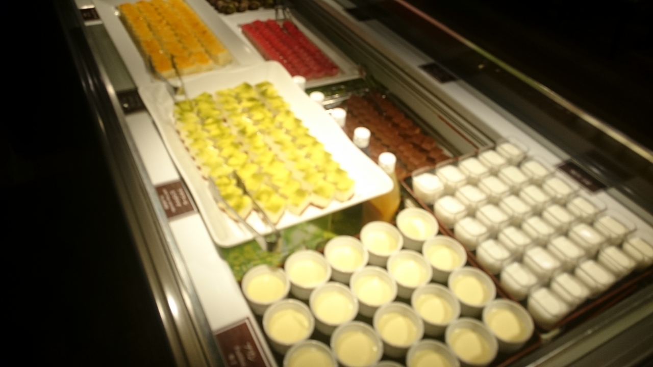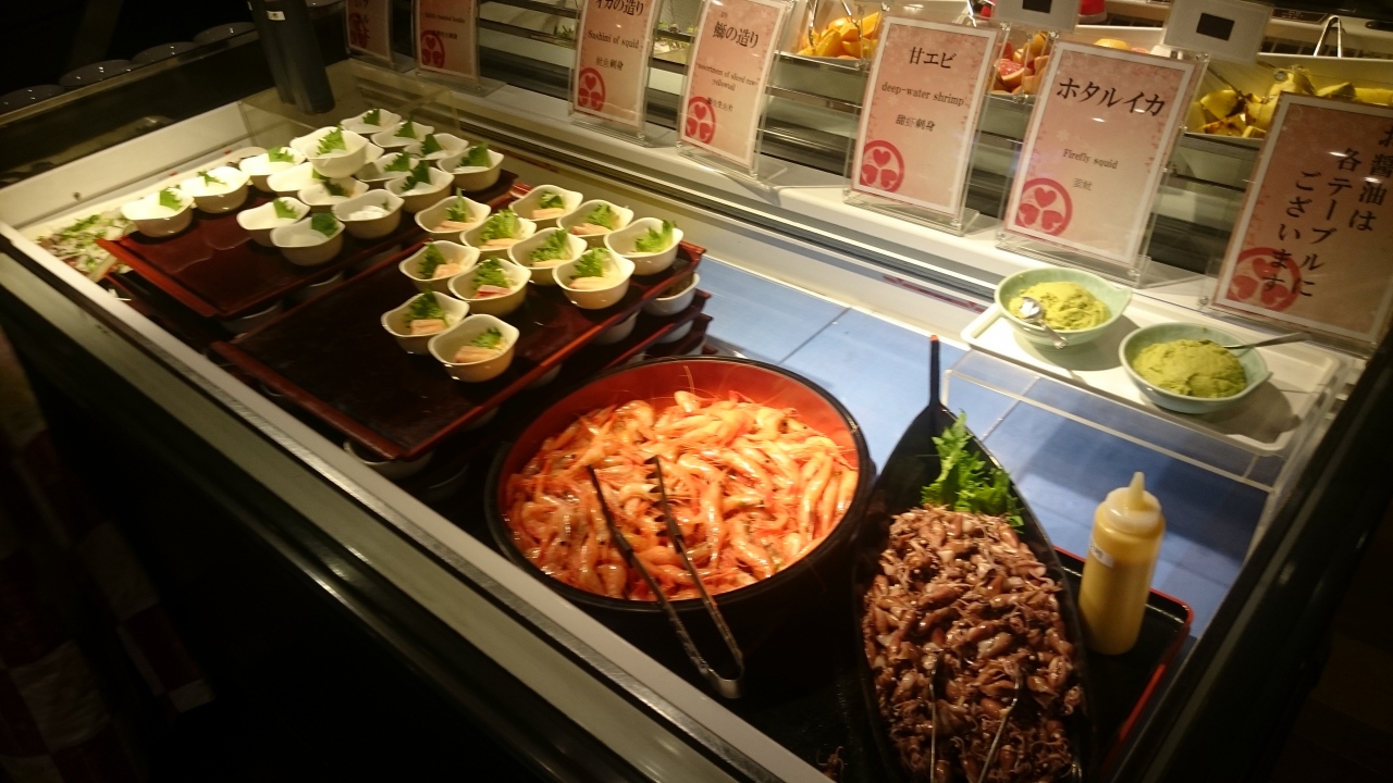 その他、寿司は6種類程度、カレーに豚の角煮、ホタルイカの酢味噌和え、ローストビーフ、甘えびの刺身にしゅうまいなど。デザートは、ケーキにプリンなど10種類程度ありますが、どれも甘味が強いので多くは食べれない仕組みになっています。