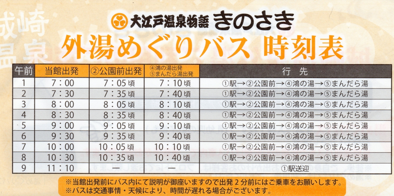 外湯めぐり:城崎温泉のメインの1つが外湯めぐり。ここの宿からは少し距離がありますが、宿専用の循環バスが出ています。(宿のHPを見ても、実際に行くまで理解できなかったので説明)