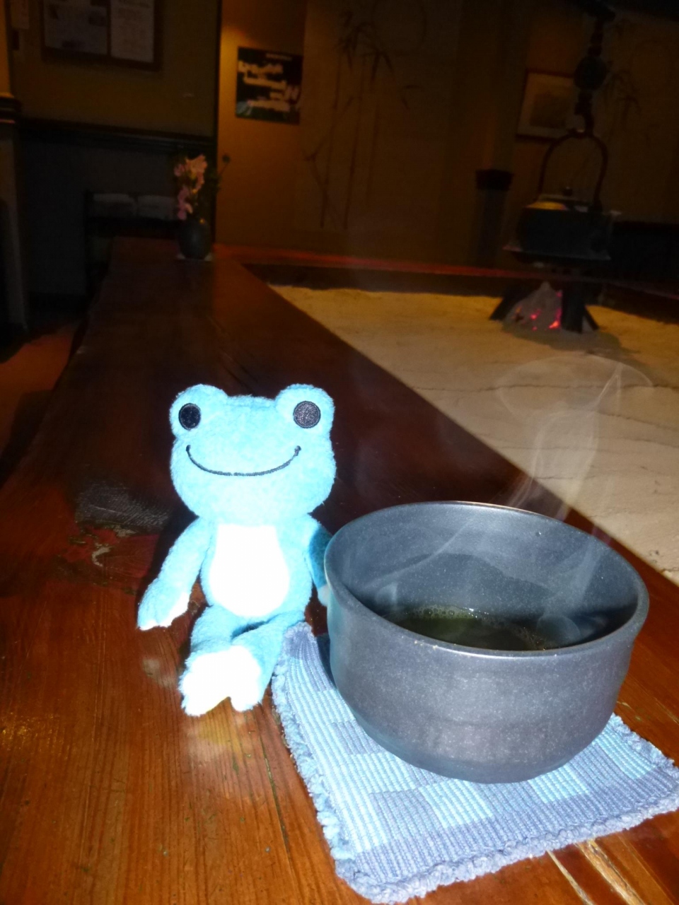 囲炉裏のあるモダンなロビーラウンジでお抹茶で出迎えてくれました。