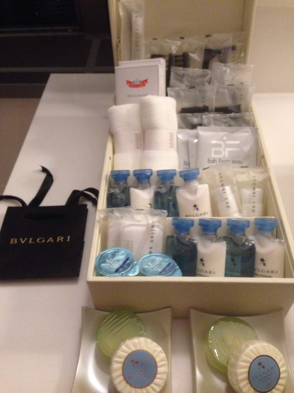 広くはありませんが都会的でオシャレなお部屋でした。そしてブルガリのアメニティー、とても良い香りです。スキンケアはドクターシーラボでした。
