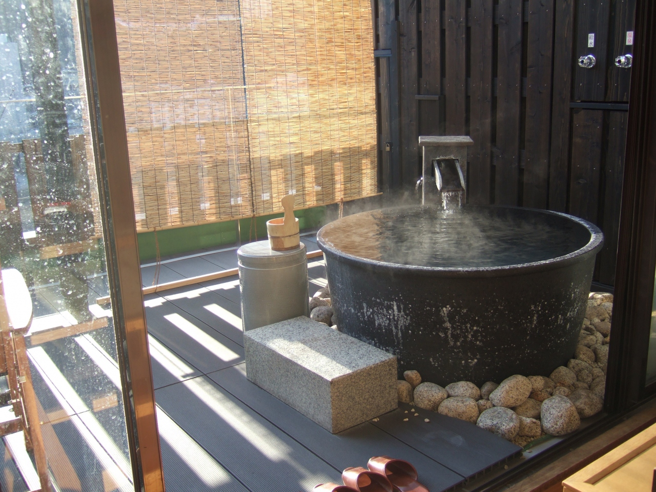 洗い場から直接露天風呂に行けないのがネックだがお風呂自体はゆったりしていて快適でした。熱いときは水を入れて調節も可能。