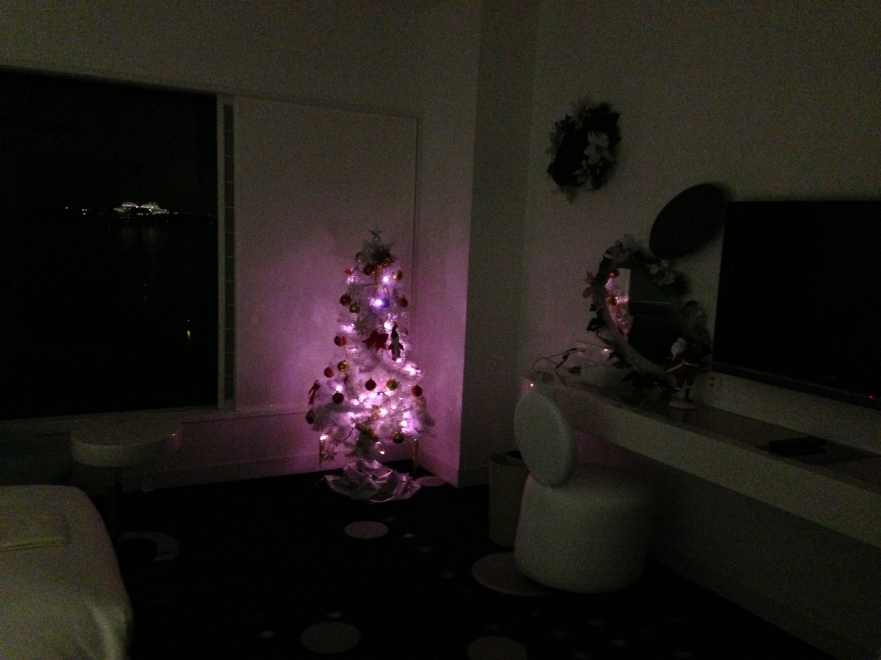 毎年ロビー横にクリスマストレインのジオラマが設置され、ツリーも飾られ、楽しい雰囲気でいっぱいです。今回は1109号室のセレブリオツインルームでしたが、クリスマスの飾りが施された素敵なスペシャルルームでした。