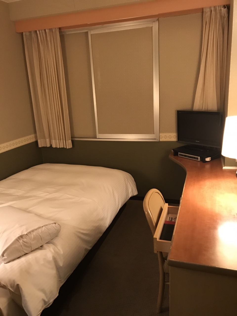 駅からは歩いて5分くらいでした。 部屋はビジネスホテルの割に綺麗です。枕や浴衣はエレベーター横から自由に持っていく方式で、枕は寝心地が良かったです。それ以外は特に可もなく不可もなく、普通のホテルです。 朝食付でしたが、出発が早かったのでまだ準備中で食べられませんでした。